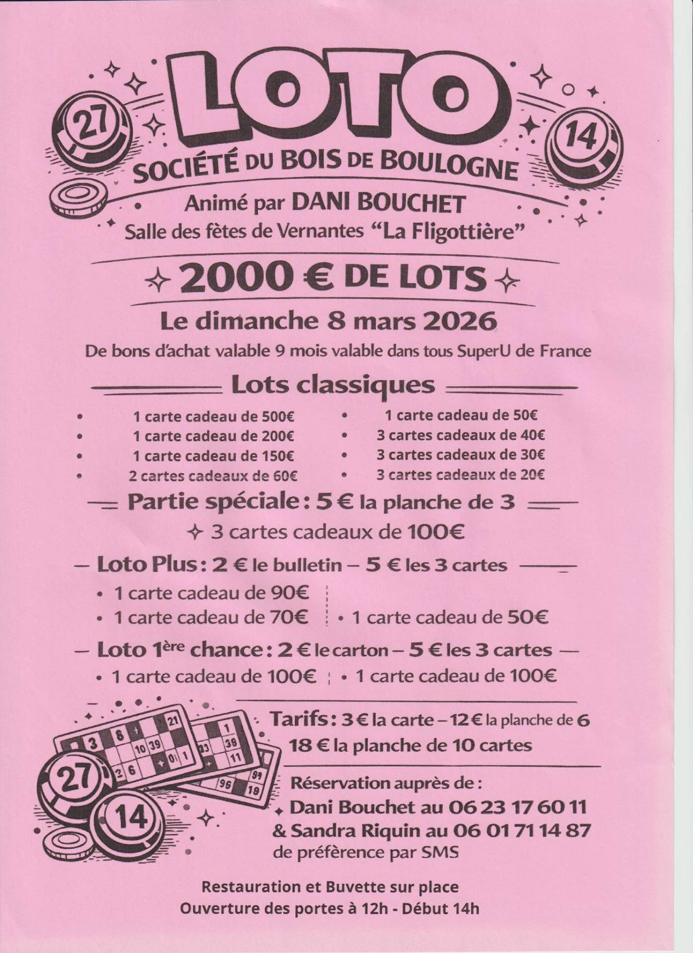 A 15 km au Nord-Est de Saumur, à Vernantes, la Société du Bois de Boulogne organise un loto dans la salle de la Fligotière, le dimanche 8 mars.