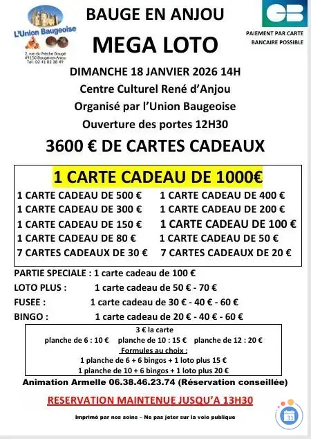A Baugé, l’Union Baugeoise vous donne rendez-vous le dimanche 18 janvier pour un Méga Loto à partir de 14h au centre Culturel René d’Anjou.